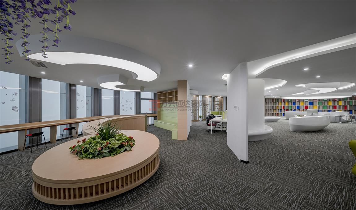 辦公室裝修公司案例:整體辦公空間設(shè)計(jì)中,大氣與細(xì)致并存,將設(shè)計(jì)與藝術(shù)結(jié)合。設(shè)計(jì)理念: 室內(nèi)設(shè)計(jì)元素均交織凝聚于行云流水的曲線流動(dòng)空間,設(shè)計(jì)表現(xiàn)形式不受拘束,每個(gè)空間都有自己特殊的弧度,致力于搭建“創(chuàng)新+智能+生態(tài)”的辦公環(huán)境。
