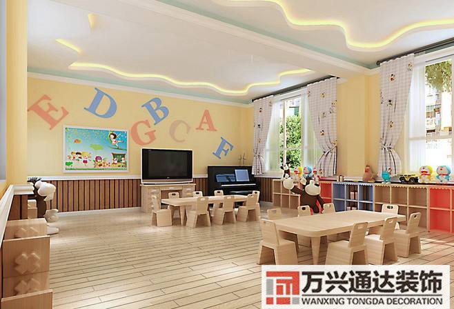 簡單的吊頂造型,相對簡單的線條體現出整個幼兒園的層次即可應科裝飾小編提醒大家切勿把整個教室裝修的非常歐式非常復雜,因為小朋友們還難以理解這些復雜的東西,而過于復雜的造型,分散幼兒的注意力,影響老師的授課簡單。