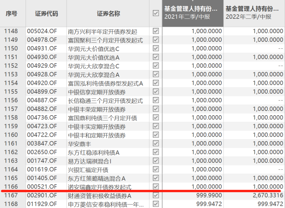 根據(jù)Choice數(shù)據(jù)顯示,以2021年基金中報(bào)為例,基金管理人持有份額1000萬份以上的基金產(chǎn)品,一共有1166只。截圖如下: