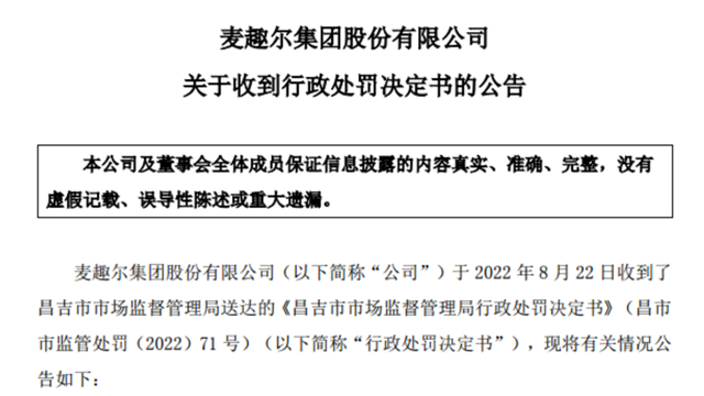 在業內看來,這一巨額罰款讓麥趣爾今年的業績情況雪上加霜。麥趣爾今日也公告稱,因面臨上述罰款,將對公司損益產生一定的影響。