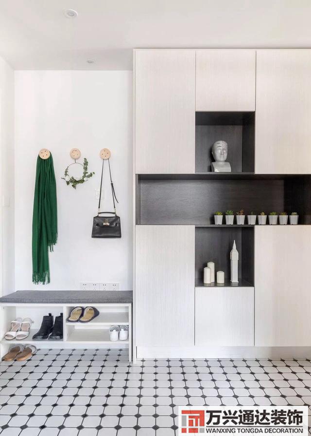 這是玄關處。愛干凈的姑媽在玄關處設置了鞋柜和衣帽間,這樣做也是為了給家里人帶去一個好印象,而且在一進門的時候就換鞋的話,有利于保持家居環境的整潔度。